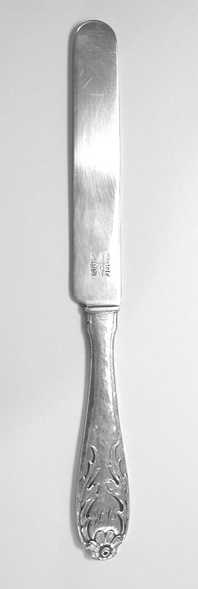 Description: The knife for use with the A/HK to A/HR child / youth set was a Sample completed April 21, 1913. The knife was made by an unlisted maker in 10 minutes, and chased by Wiliam E. Jordan for 4 1/4 hours. The knife 7 1/4 inches long. It weighs 1.7 troy ounces.