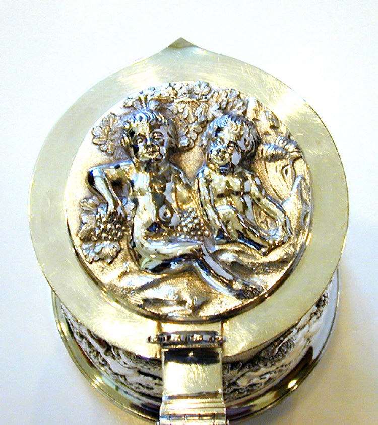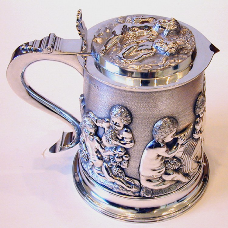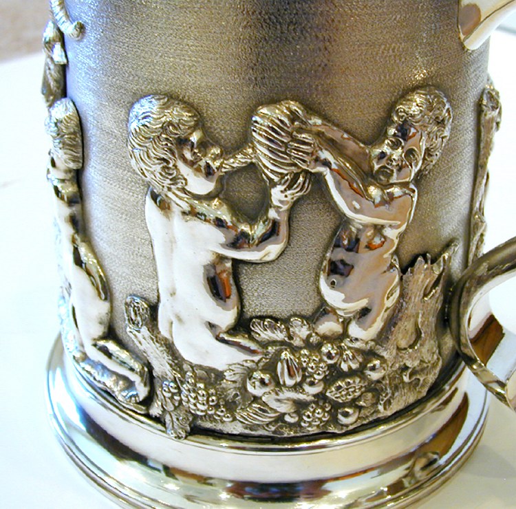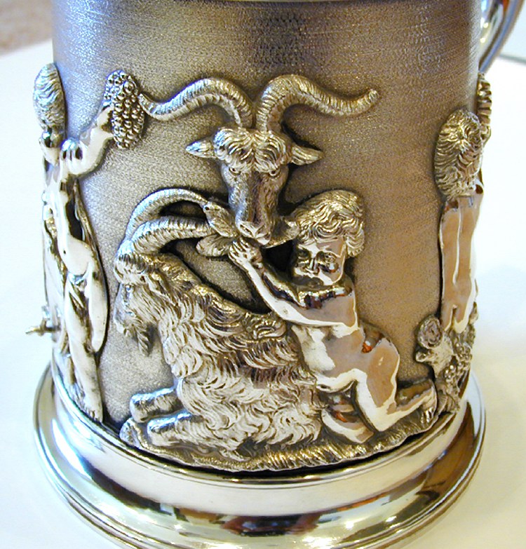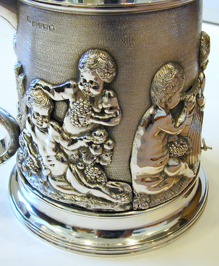 Description: The large, heavy tankard (57.5 troy ounces) is embellished with cast and applied figures of cherubs / putti celebrating. There are grapes, goats, and a liquor barrel where the spout is three dimensional. The overall surface is matt / stippled. The inside of the tankard is gilt. It measures 8 inches to the top of the thumbpiece, and has a bottom diameter of 6 1/8 inches.